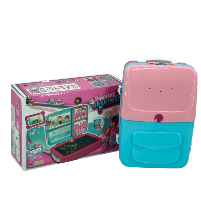 Рюкзак-столик складной с набором для рисования. В комплекте: двухсторонняя доска для рисования, 2 маркера, 4 мелка, картинки-раскраски, магнитные буквы англ. алфавита + магнитные цифры и знаки.