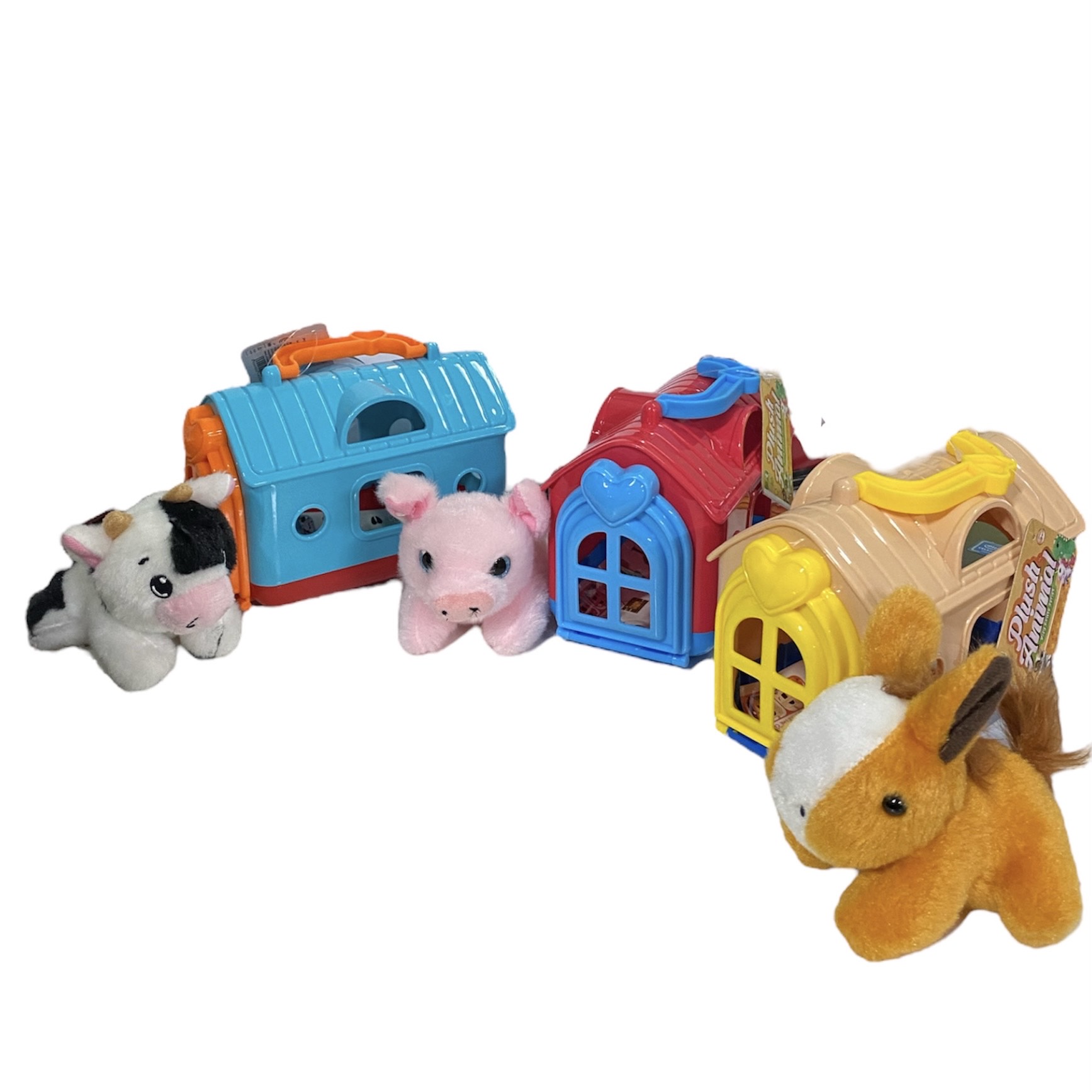 Милые мягкие игрушки животных в переносках. В комплекте наклейки, которыми можно украсить переноску. Переноска: 13*11*8 см. Животное: 10 см. В ассортименте корова, свинья, осёл.