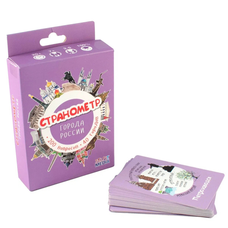 Настольная карточная игра "Странометр. Города России". Каждая игровая карточка содержит набор фактов о 40 городах и 5 вопросов о каждом из них. Запоминайте факты на одной стороне карточки и отвечайте на вопросы на другой!