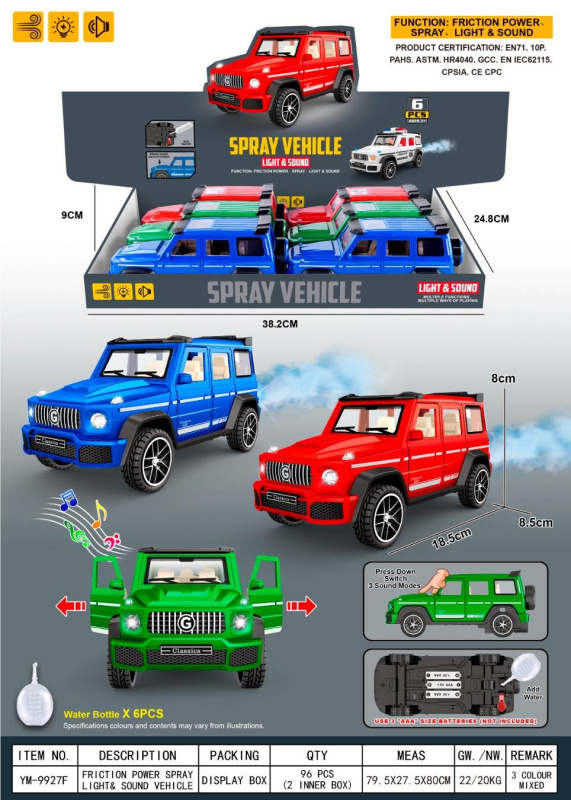 Машина с эффектами пара. Со световыми и звуковыми эффектами. Материал: пластик. Инерционный механизм. 3 цвета в ассортименте. Работает от 3х батареек (в комплект не входят)
