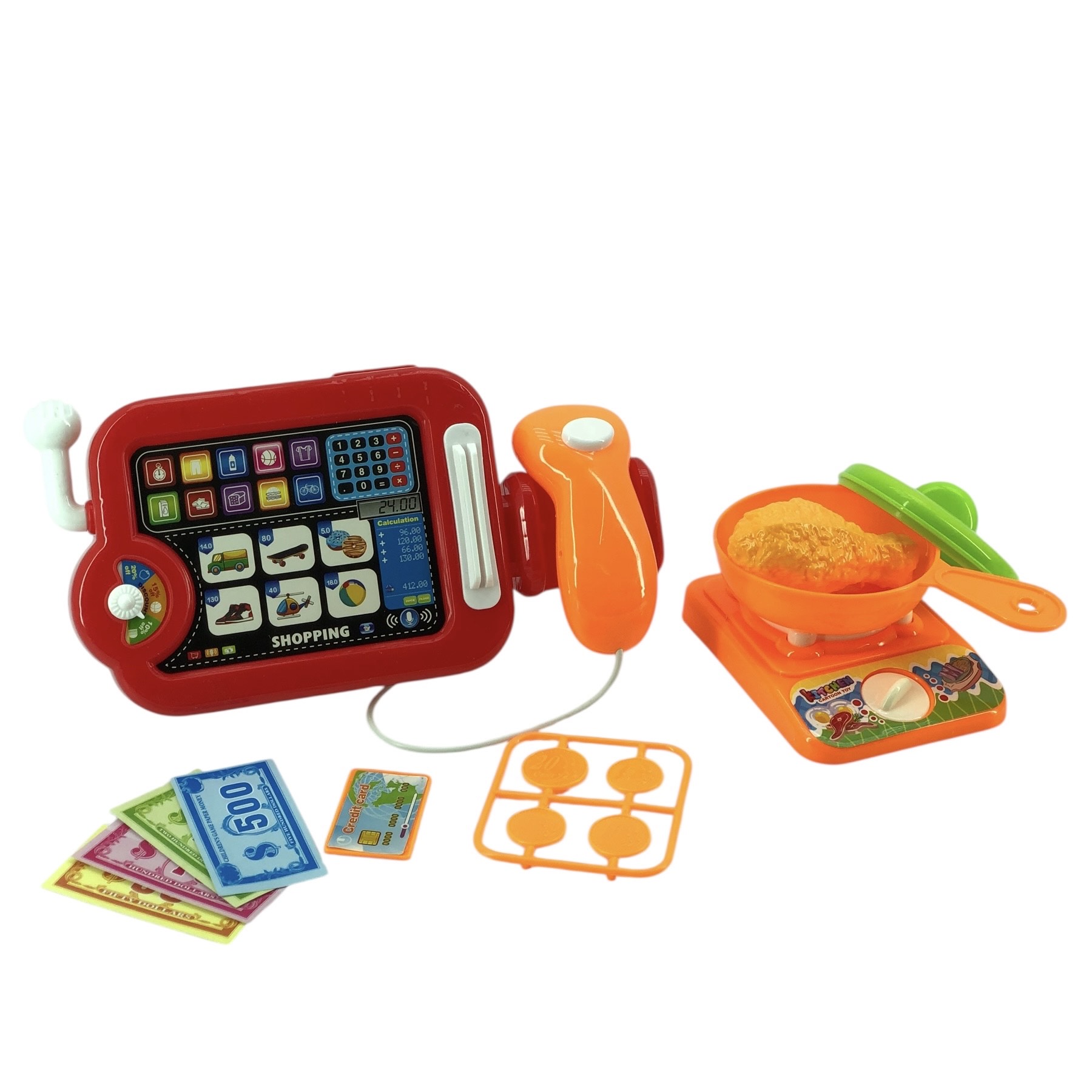 Набор "Супермаркет. Касса" со звуковыми эффектами. В комплекте: кассовый аппарат, газовая плита, сковорода, монеты, деньги, карточка, куриная ножка. Воспроизводит звук сканера.