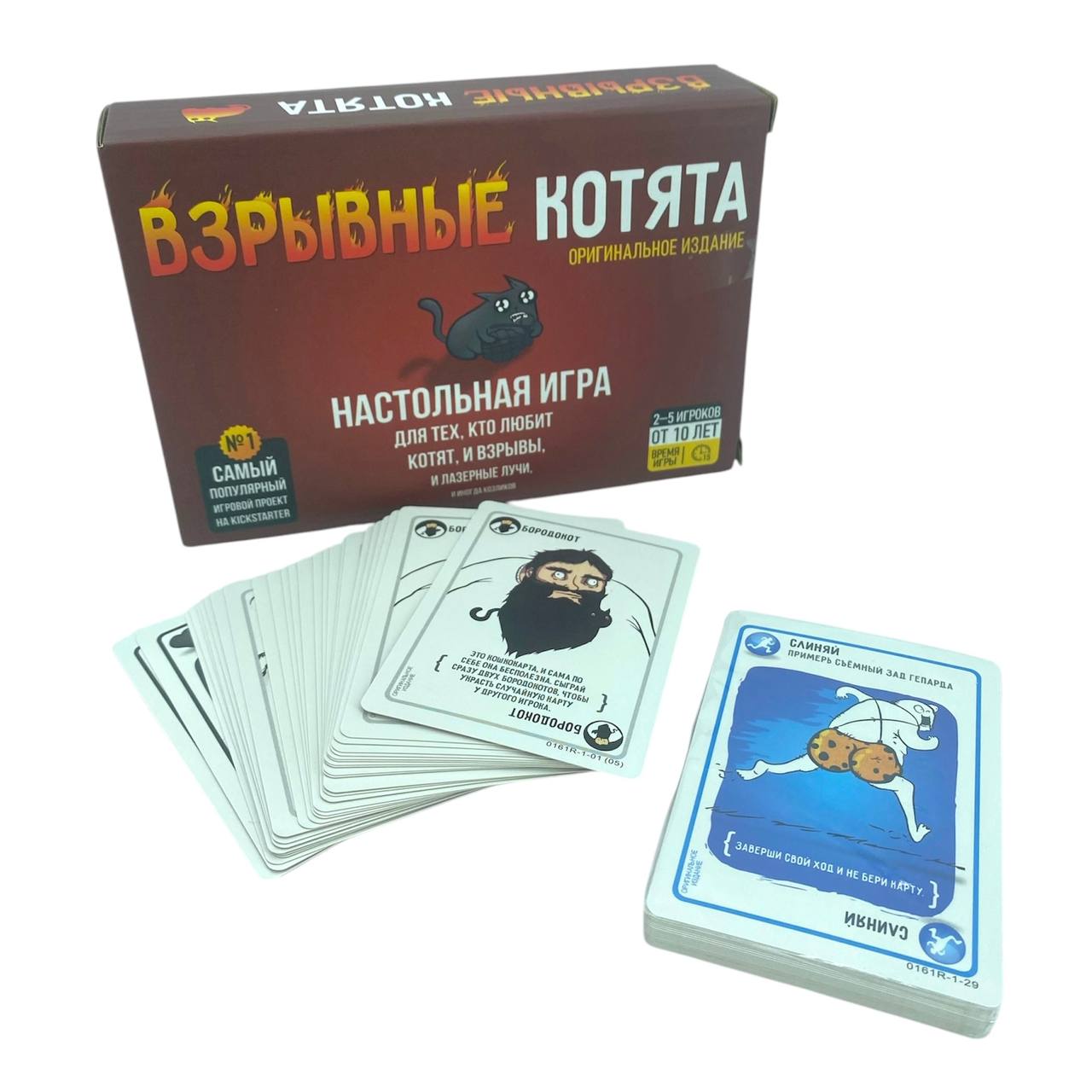 Настольная игра «Взрывные котята» — это нашумевший карточный хит. Игра отдалённо напоминает своим принципом «русскую рулетку» — игроки тянут по очереди карты из колоды, и, если им попадается один из взрывных кодек, то он тут же взрывается и выбывает из игры! Для того, чтобы этого не произошло, можно использовать различные карты или даже их комбинации. Победит игрок, умудрившийся за всю партию не подорваться на Котейке, то есть, последний оставшийся в живых игрок!