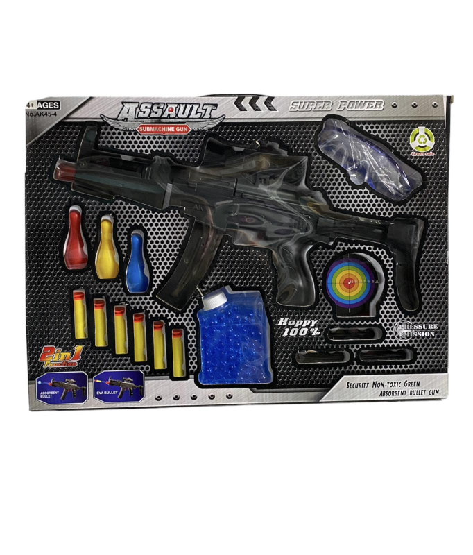 Игрушечный пистолет AK45-4. В комплекте: пистолет-пулемет с прицелом и прикладом; защитные очки; ёмкость для гелиевых пуль (пули в пакетике)6 мягких патронов 3 кегли; 3 мишень для стрельбы. Размер игрушки 48*23 см