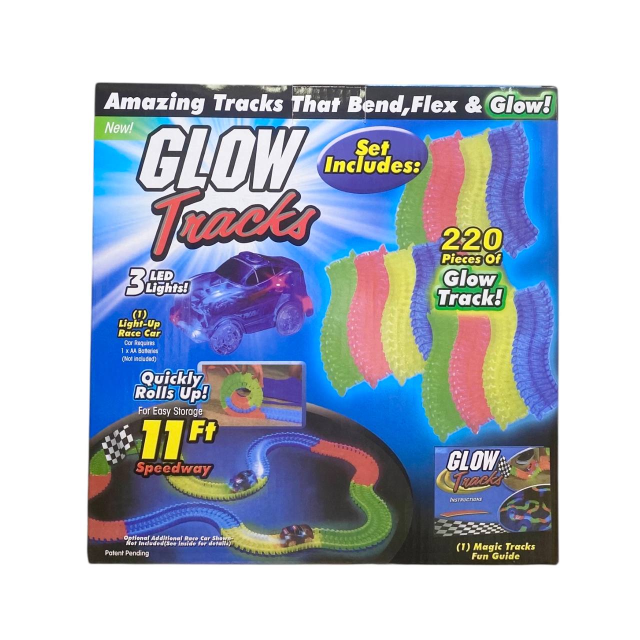 Гибкий трек с машинкой. Дорогу можно не просто собрать так, чтобы она поворачивала и петляла в разные стороны благодаря специальным деталькам-рельсам, но также можно делать различные препятствия и горки, используя для этого любой предмет. Комплектность-220 деталей.