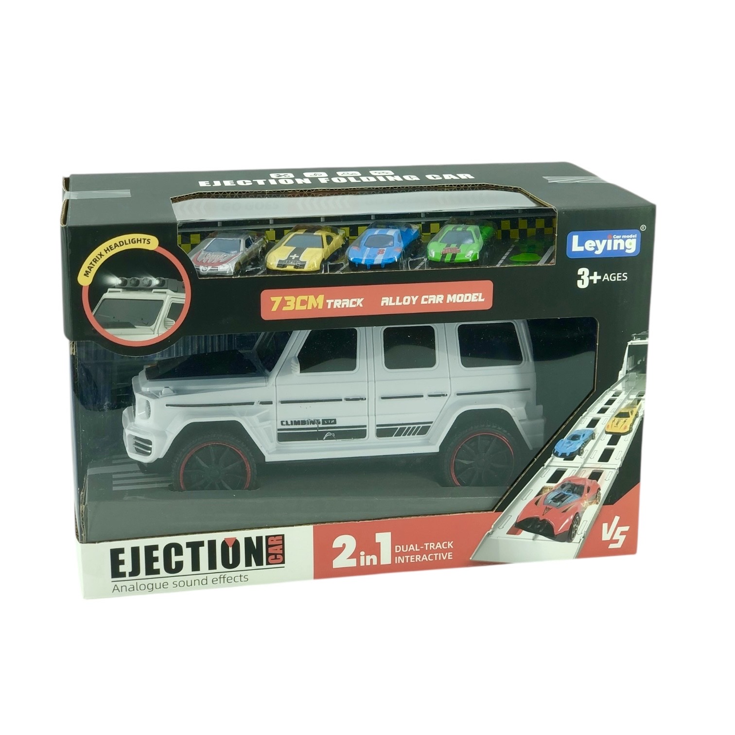 Автовоз с выдвижной трассой в виде джипа Гелик. Гелендваген является также самостоятельной машинкой с инерционным механизмом. Машинка оснащена световыми и звуковыми эффектами. трасса 50 см