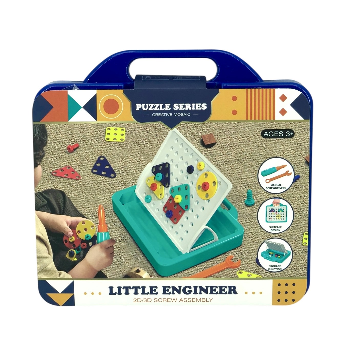 Конструктор с отверткой и гаечным ключом. В комплекте: кейс- основа, детали, которые можно соединять инструментами.