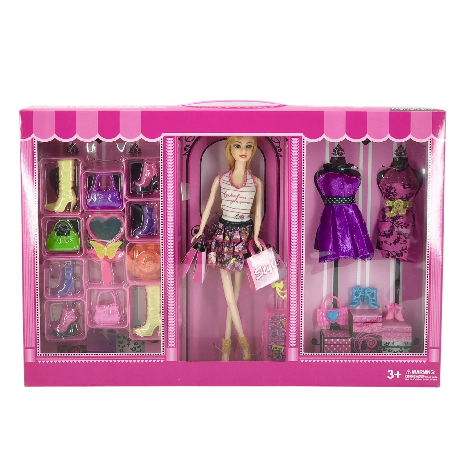 Гардероб для куклы. В комплекте: кукла, 2 платья, 6 пар обуви, 2 сумочки, шляпа, зеркало.