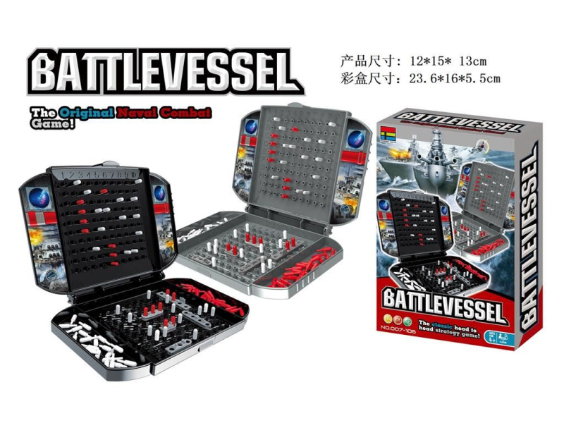 Настольная игра "Морской бой". В комплект входит 2 игровых поля (чемоданчика), красные и белые фишки, корабли (по 5 штук для каждого игрока), наклейки. Размер игрового поля: 15*11*15 см. Размер упаковки: 24*16*6 см.