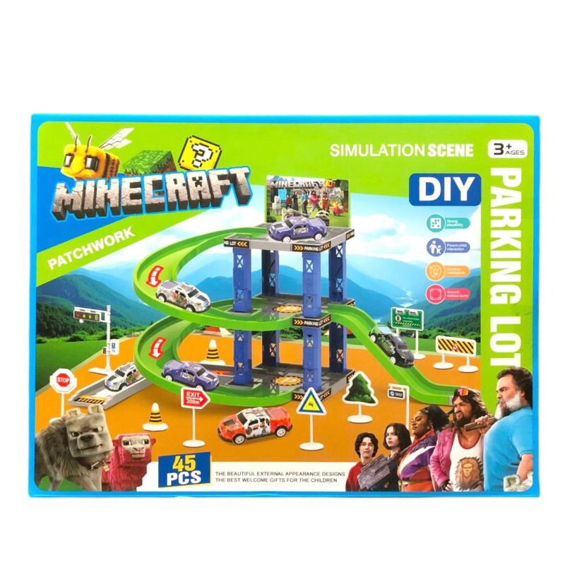 Многоуровневая парковка в стиле "Minecraft". В наборе 3 машинки, дорожные знаки.