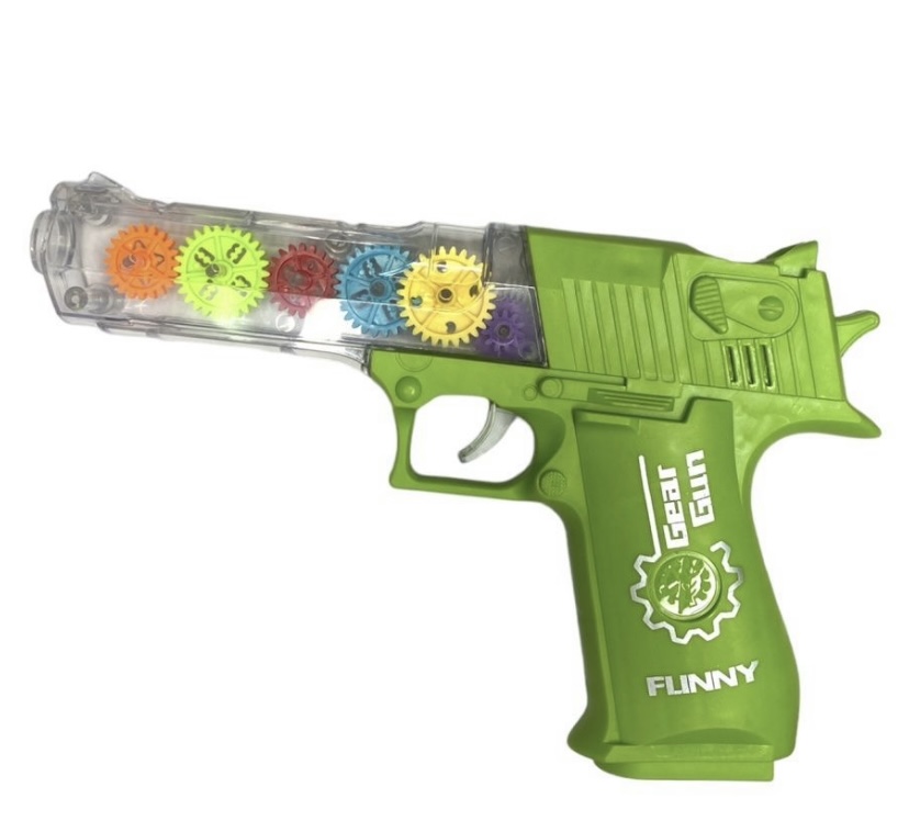 Игрушка "Пистолет прозрачный с движущимися шестеренками" со световыми и звуковыми эффектами.