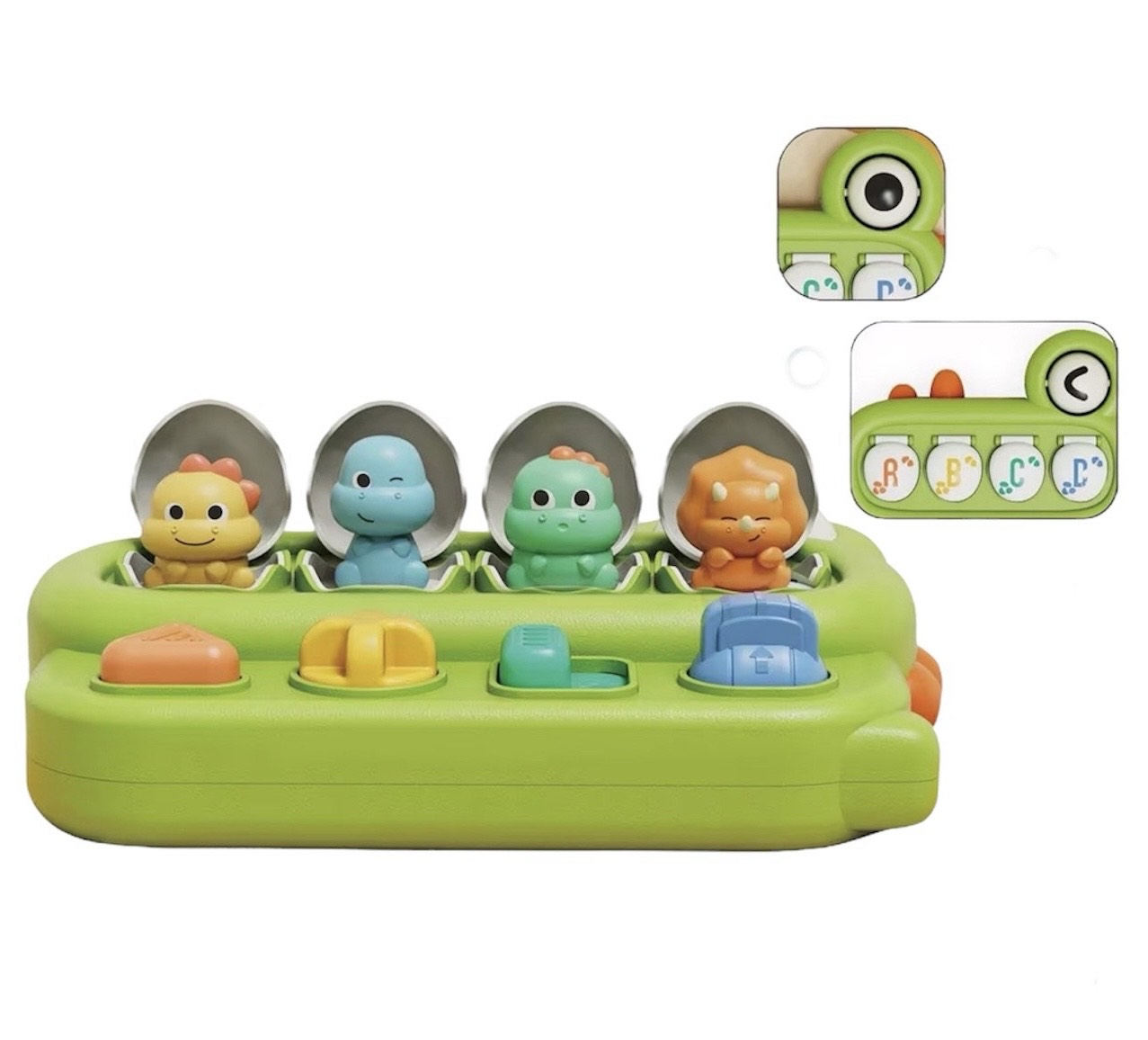 Игра развивающая "Прятки. Динозаврики". Детская тактильная игрушка оснащена крышечками с буквами, под которыми прячутся маленькие очаровательные динозаврики. Чтобы их увидеть, нужно взаимодействовать с каждой кнопкой различными способами: нажать, покрутить, переключить.