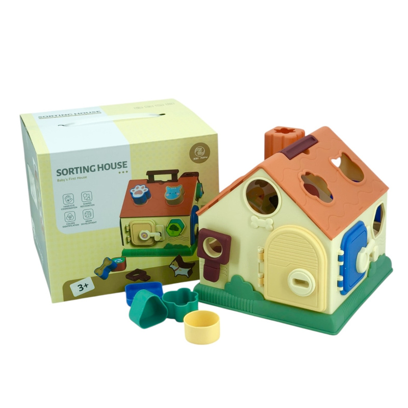 Домик-сортер для малышей. В комплекте домик, фигурки сортеры 8 штук, ключики, набор наклеек.