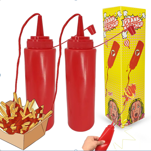 Игрушка-пранк. В бутылке находится веревочка, которая при нажатии на пластиковую бутылку выпрыгивает как струя кетчупа.
