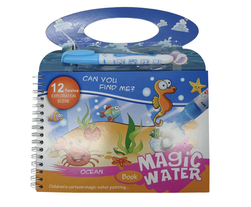 Водная раскраска Book magic water. Яркая и многоразовая книга-раскраска , сделана из плотного мелованного картона с закругленными краями. В комплекте идёт маркер, который заправляется водой. На каждом книжном развороте помимо страницы с развивающими заданиями, находится страница с картинкой-раскраской, которая проявляет свои яркие цвета после соприкосновения с мокрой кистью маркера. Размер: 20х22 см